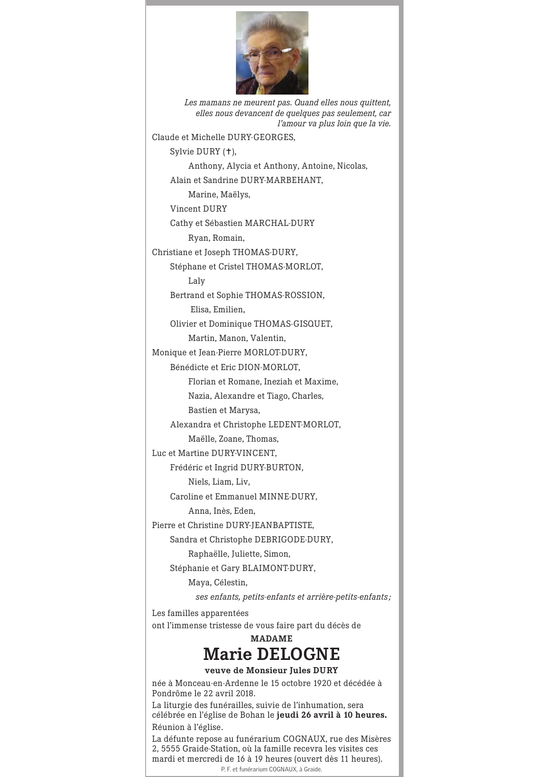 Décédée à Pondrôme (5574) le dimanche 22 avril 2018 à l'âge de 97 ans