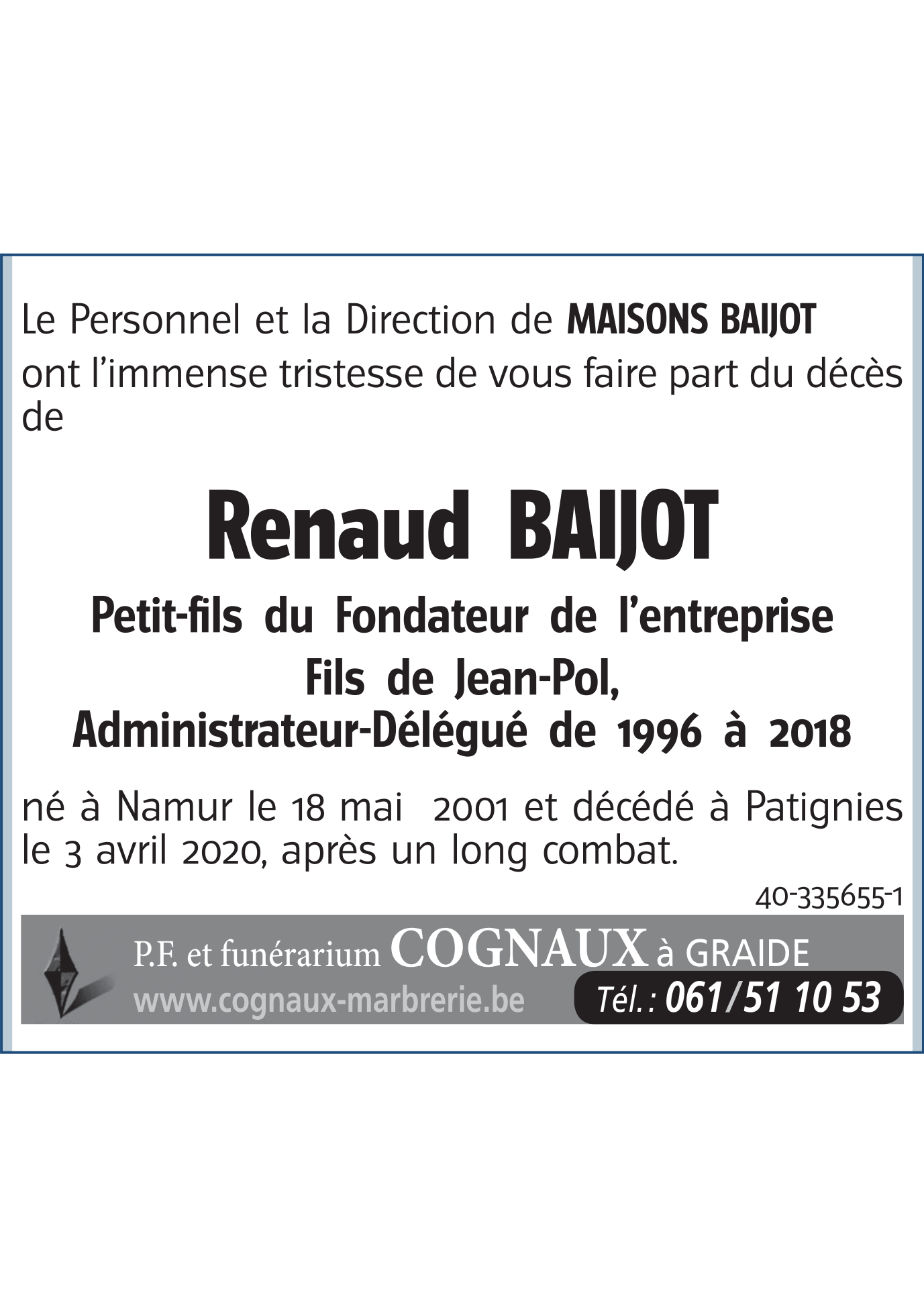 Décédé à Patignies (5575) le vendredi 3 avril 2020 à l'âge de 18 ans