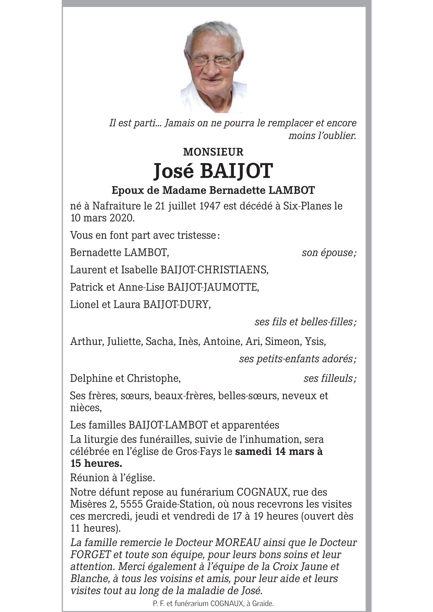 Décédé à Six-Planes (5555) le mardi 10 mars 2020 à l'âge de 72 ans