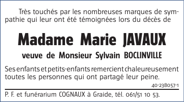 Veuve de Monsieur Sylvain BOCLINVILLE
