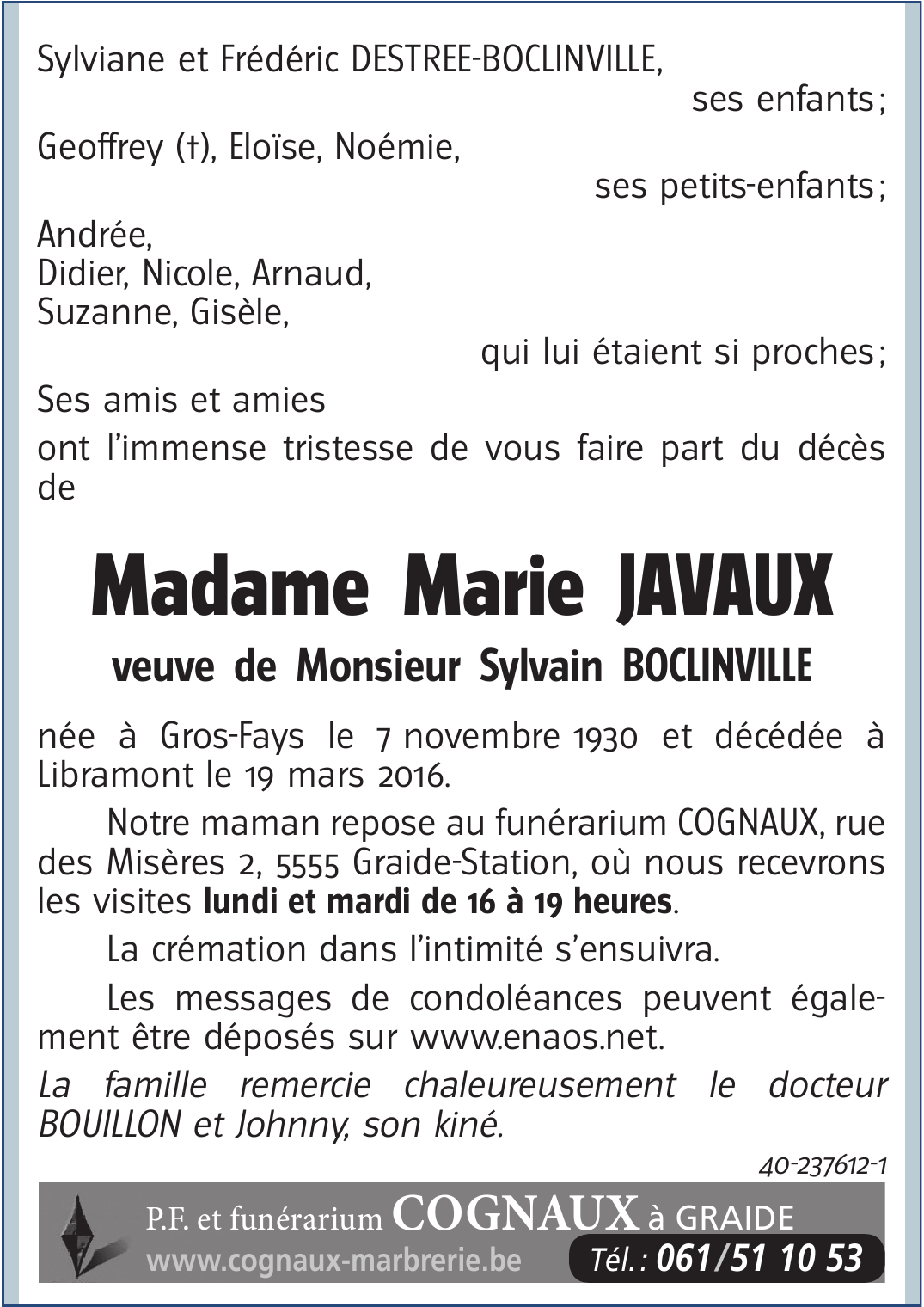 Veuve de Monsieur Sylvain BOCLINVILLE