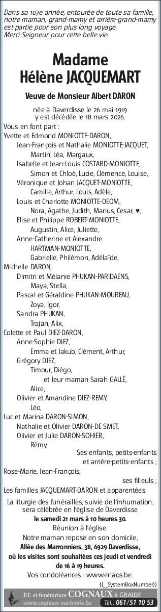 Décédée à Daverdisse (6929) le mercredi 18 mars 2026 à l'âge de 106 ans