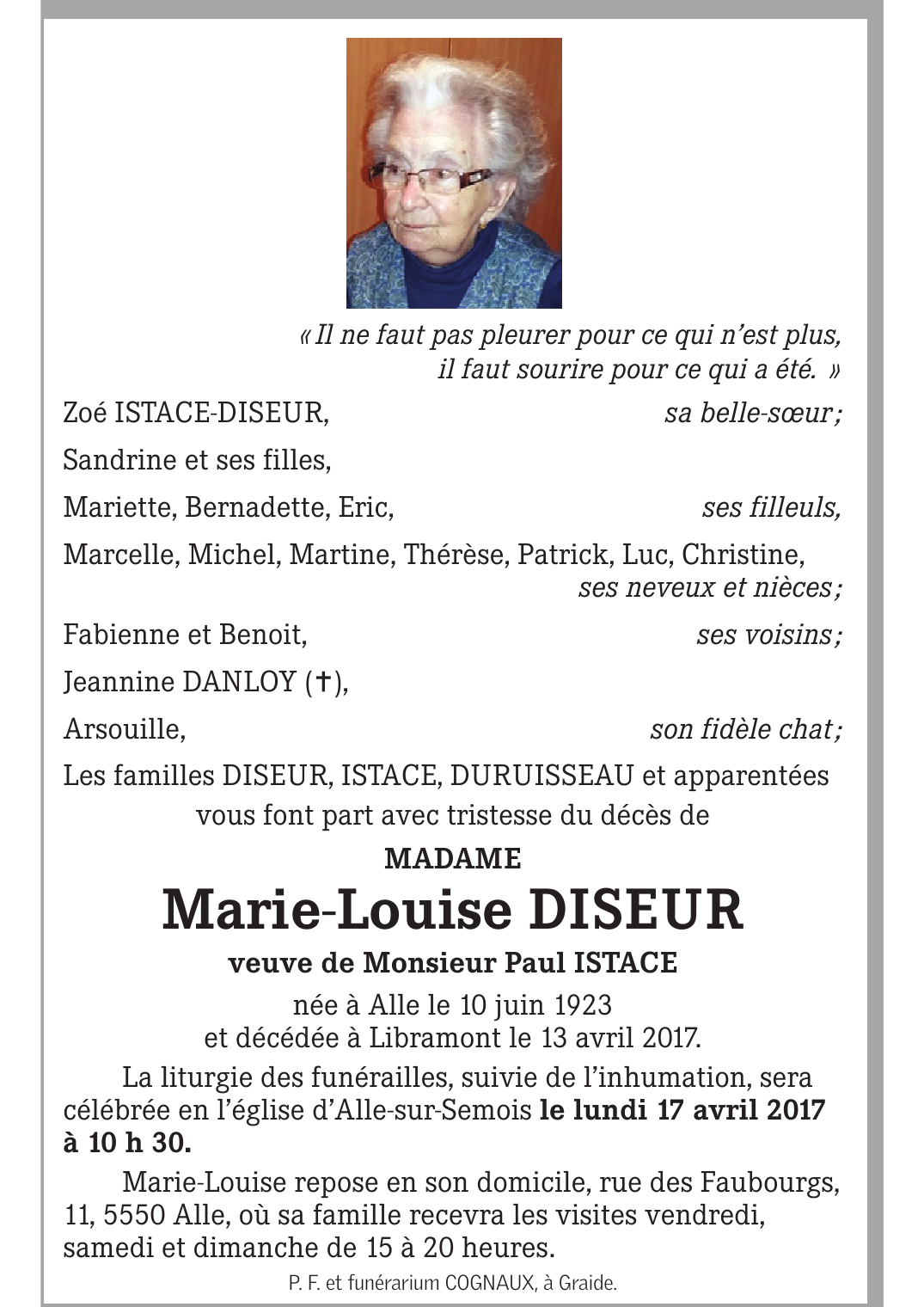 Décédée à Libramont (6800) le jeudi 13 avril 2017 à l'âge de 93 ans