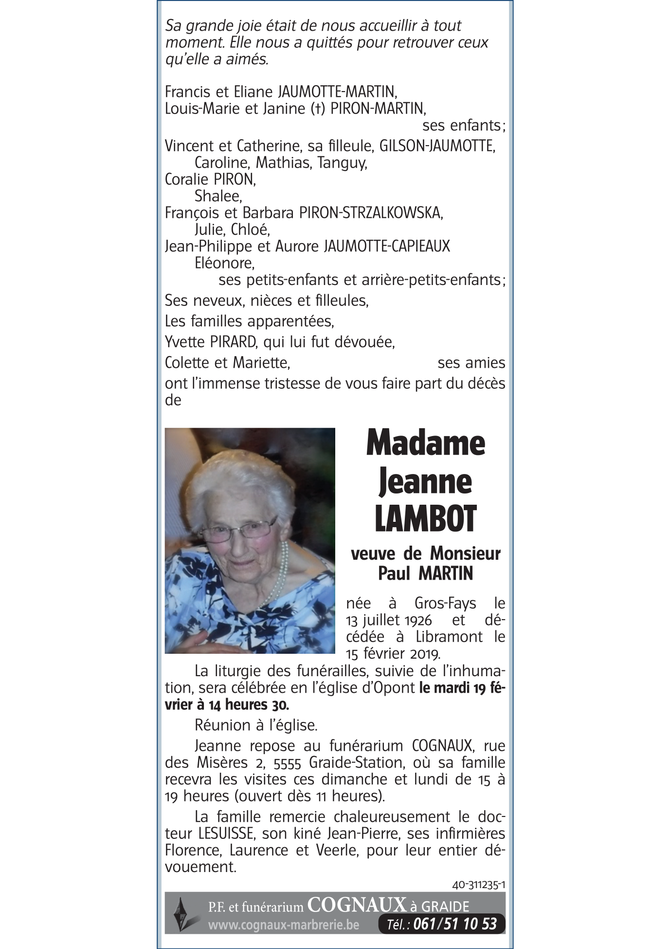 Décédée à Libramont (6800) le vendredi 15 février 2019 à l'âge de 92 ans