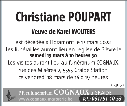 Décédée à Libramont (6800) le jeudi 17 mars 2022 à l'âge de 80 ans