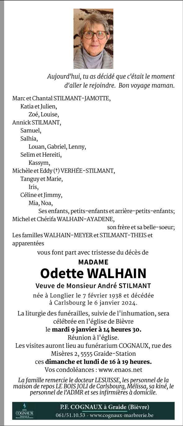Décédée à Carlsbourg (6850) le samedi 6 janvier 2024 à l'âge de 85 ans
