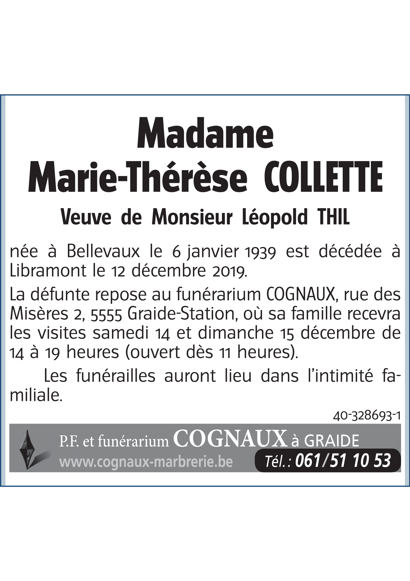 Décédée à Libramont (6800) le jeudi 12 décembre 2019 à l'âge de 80 ans